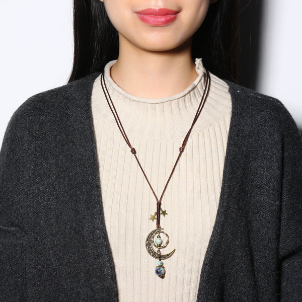 Vintage Star Moon Necklace Ethnic Ceramic Adjustable Pendant